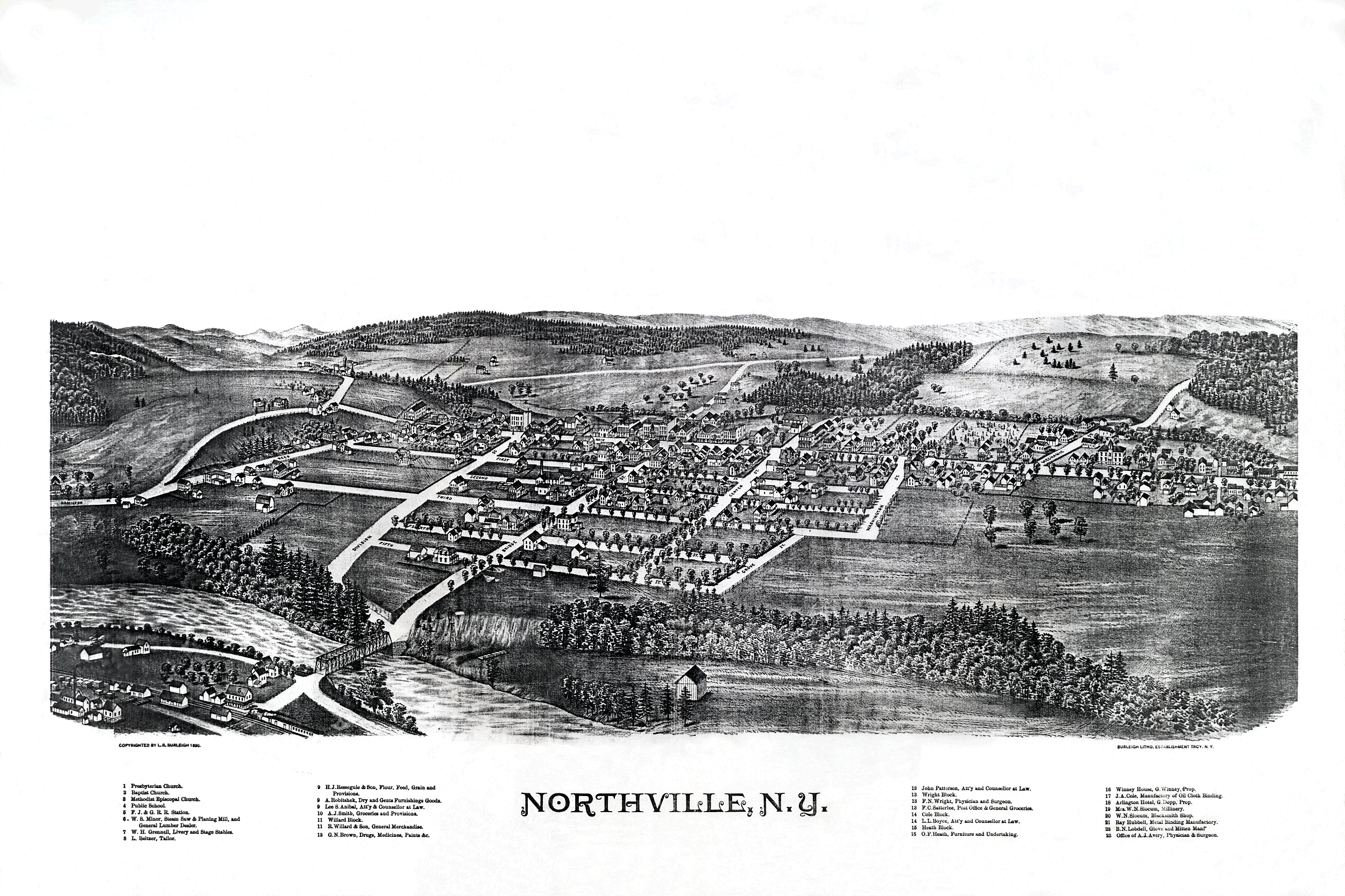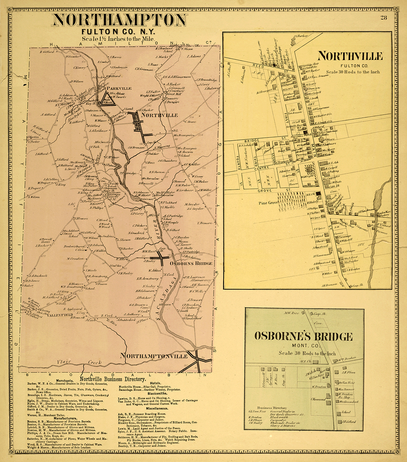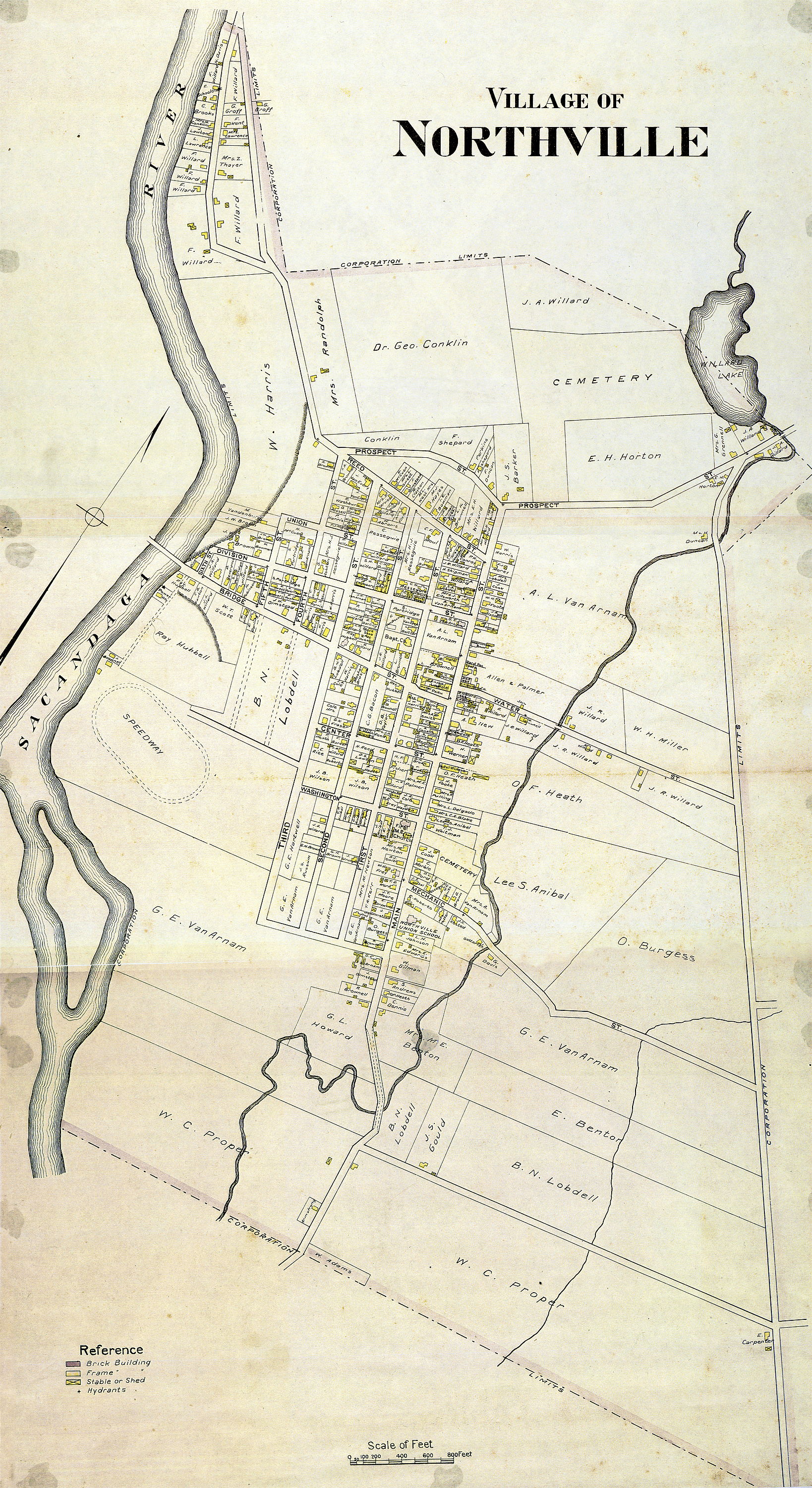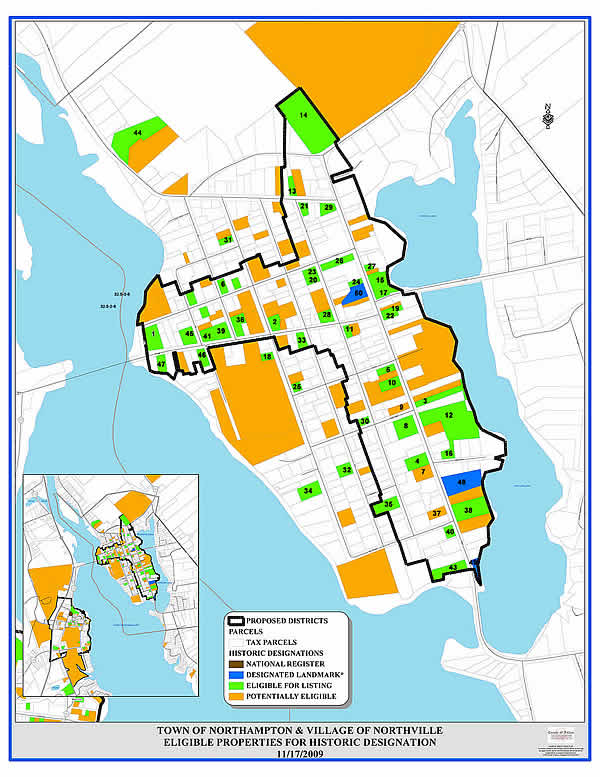 Northville is located on a small peninsula between the Sacadaga River (now the Great Sacandaga Lake) and Hunter's Creek (now the Little Lake). The Village was laid out as a rectangular grid. Some early maps of Northville can be found here: 1890 Burleigh Litho of Northville; 1905 New Century map of Northville; an earlier map of Northampton. Note on the latter that Parkville and Osborne Bridge were flooded in 1930. Some Parkville houses were moved to Northville. Main Street originates from around 1797. A road up to Main Street from a ford in the river (now Washington street) dates from 1794. Northville's location along the Sacandaga River made it a transportation hub for lumber. The opening of the FJ&G railroad line to Sacandaga Park and Northville in 1875 greatly contributed to local economic growth. Sawmills and manufacturing also built the wealth of the community and lead to the construction of substantial residential structures. Most originate from between 1890 and 1910.Based on the 2010 historic resource survey of Northampton there are approximately 50 National Register Eligible (NRE) buildings in Northville. Their location is shown in green on the adjacent map. Click on a number to see the summary listing. There are another 30 potentially eligible buildings (orange). Eligibility is primarily based on age and architectural integrity. Many are Victorian style or sub styles thereof, such as "Queen Anne" and "Stick". Three buildings - the former Hotel on North Main Street (#50), the Northville/Northampton School House Museum (#48) and the Spier House (#49) on South Main - are listed on the Local Northampton Register (blue). There is one NR listed building in Sacandaga Park (brown; in the inset). |