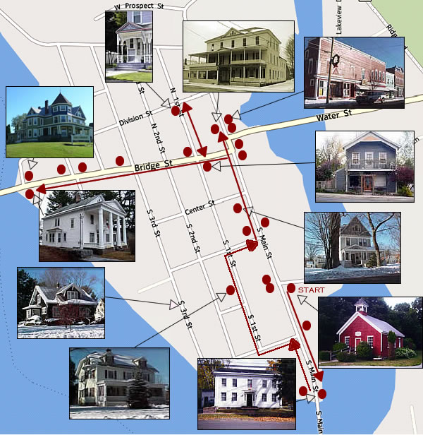 A good starting point is the Northville-Northampton Museum on South Main St. The museum has a wonderful collection of historical photographs, maps, tools, books and every-day use objects, covering the development of the village, the town and the hamlets of Sacandaga Park and Fish House. Then cross the street to 401 S Main the Kerr House. It was built in 1898 by a man from NY City for his two unmarried sisters. There is a similar house on 411 S First - the Conover House. Next door is the Joseph Spier House, a Greek Revival style built in 1819. The (later added) porch has round columns with Corinthian capitals, cobble stone bases and other unique touches. Walk south and pass the Felter House at 432 S Main; built in 1860 in Federal style with 1930's Greek revival additions. Continue to 520 S Main - the Spier House, built in 1825 and constructed with hand-hewn beams. Joseph Spier operated a mercantile business from 1825 to 1856. He was the first Northville postmaster. During the 1940's Mel Graff, the originator of the syndicated cartoon strip "Secret Agent X9", lived here with his wife and daughter. Across the street is a folk-Victorian house known as "The Homestead" aka Dr. Grant's House. Now walk back north over First Street, past the Conover House to 251 S First. This two-story colonial revival has a number of interesting architectural features such as the grouped porch columns, a Palladian style attic dormer window and a pleasing first to second floor bay window. Turn right on Washington St and pass the Cole House on 241 S Main. James A Cole (1833-1910) was a pioneer lumberman and inventor. He also formed the Northville Granite Co and built the Cole building on Main St - now occupied by the Masons. Across the street is the Anibal House, a 21/2 story wood frame Stick-style Victorian. The stoop entry has a lot of interesting decorative detail. The interior is original and includes a very pretty stairwell. Lee Anibal was a lawyer, admitted to the bar in 1879. He once owned the largest law library in Fulton County. Walk north on Main towards the commercial center. Note the Palmer House at 221 S Main - a queen Anne Eastlake style Victorian; the facade has many decorative features (and some additions in the rear). Then another Eastlake style - the G.N. Brown House) at 201 S Main. Mr Brown was a respected pharmacist. This house has retained its integrity and there is lots of architectural and decorative detail. The commercial center is at the intersection of Main, Bridge and Water Streets. |